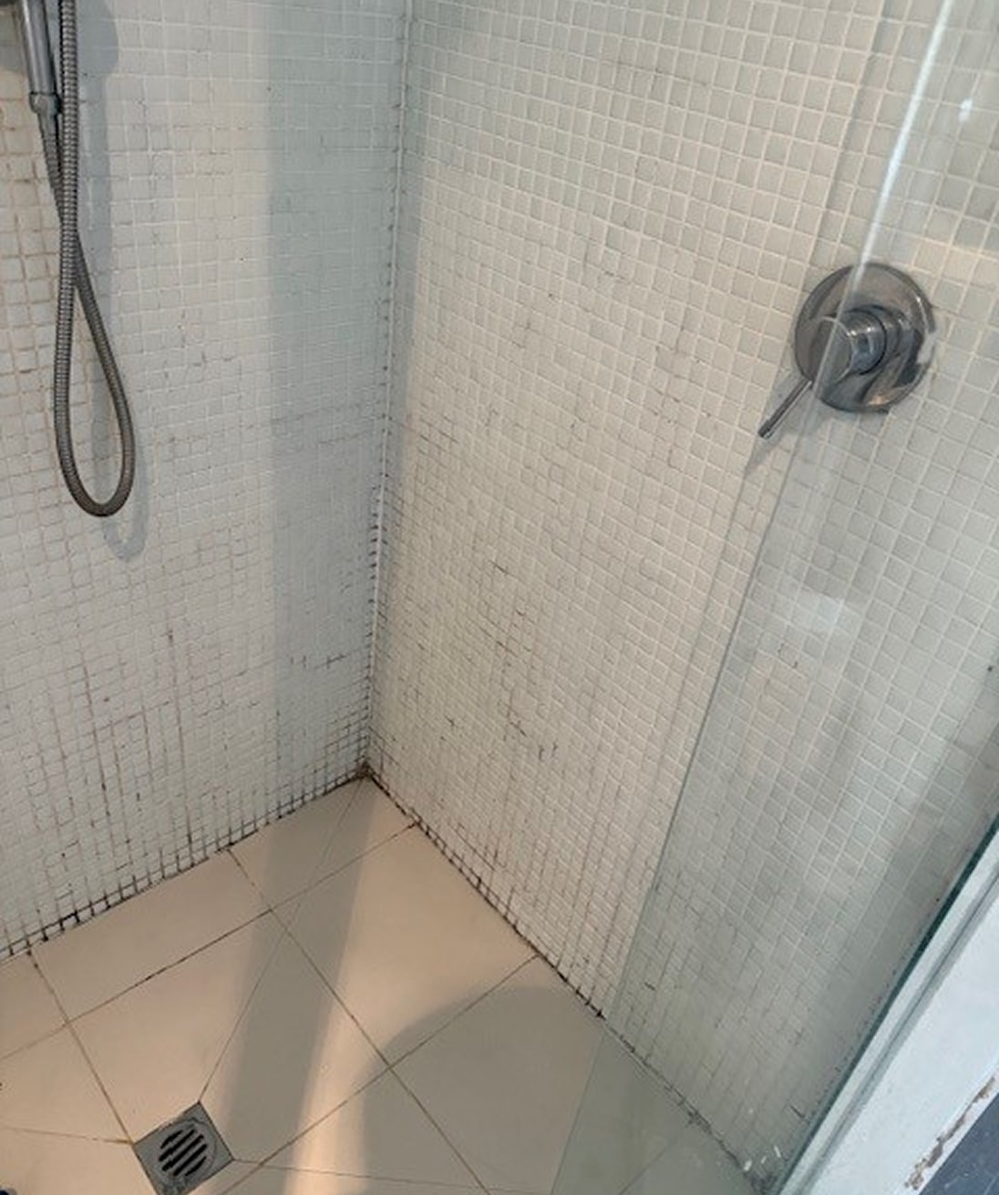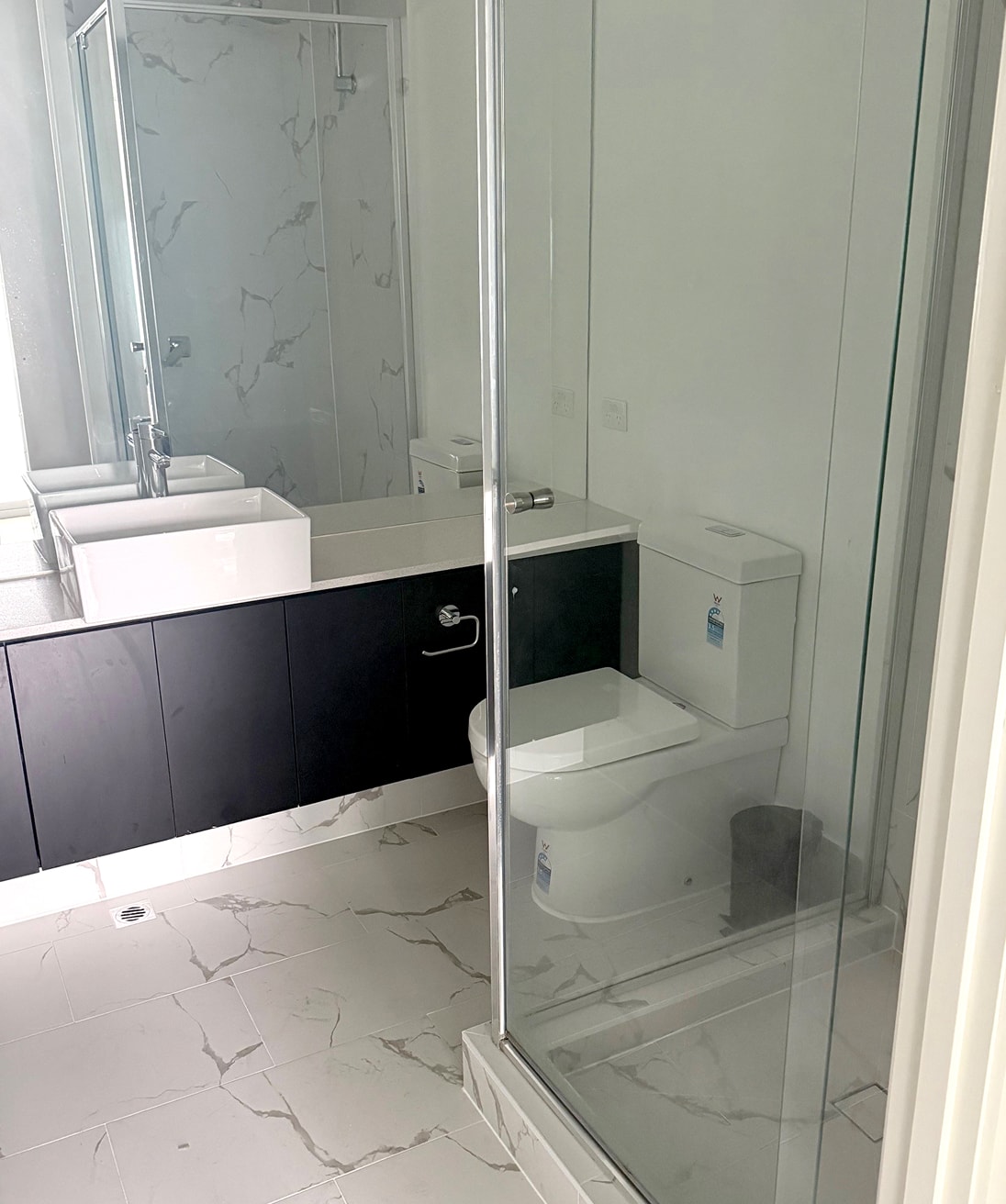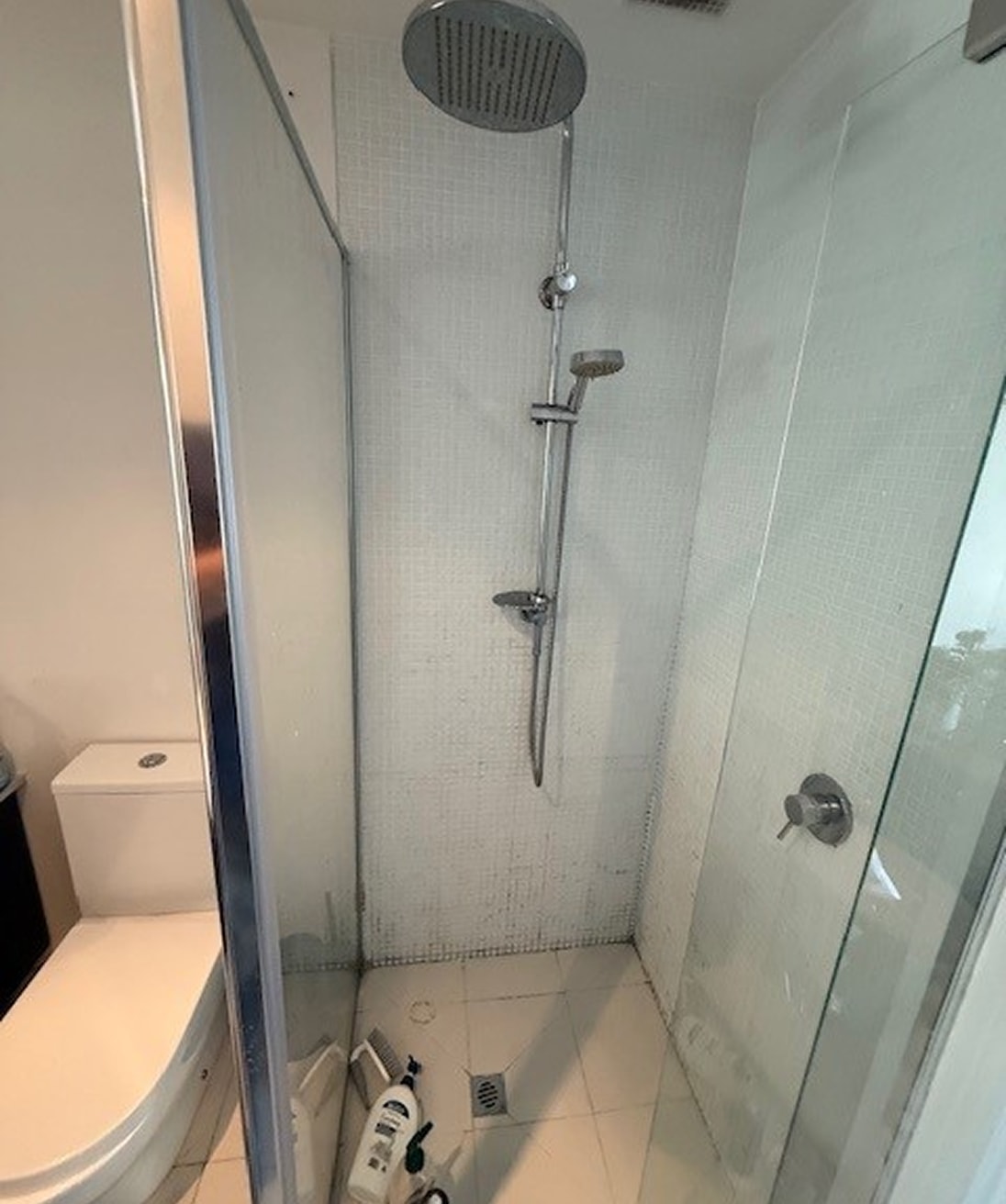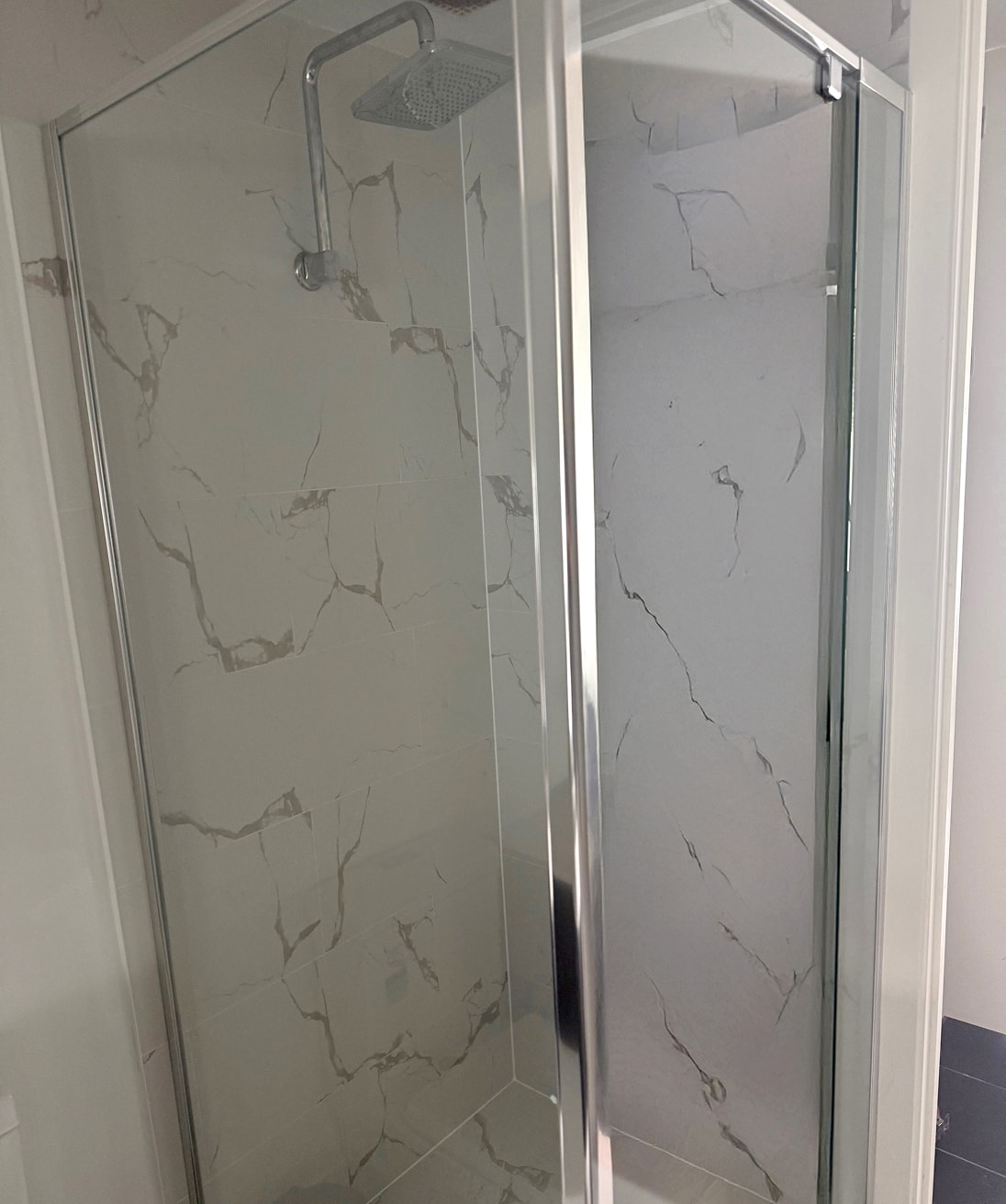 Now fully restored, the shower features new cladding, waterproofed walls and floor, modern tiles, and the reinstalled shower screen complemented by updated tapware.
